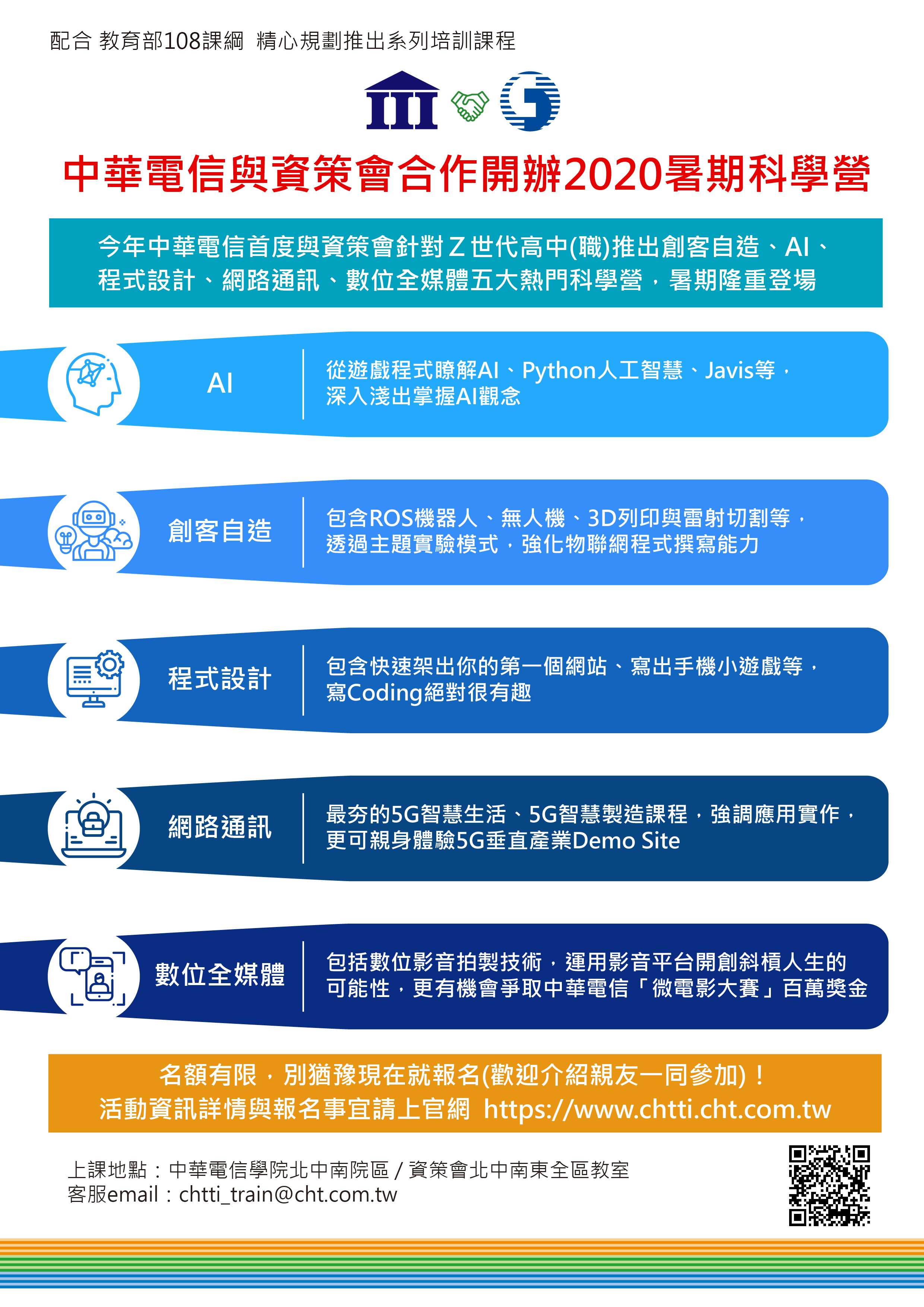 二、近年來中華電信學院除積極扮演產官學研交流平台之角色,同時關心莘莘學子,期能厚植高中(職)生數位時代的科技實力,暑期營隊活動除了讓高中(職)生提前接觸新興科技、也培養團隊合作與問題解決能力,名額有限,敬請把握。