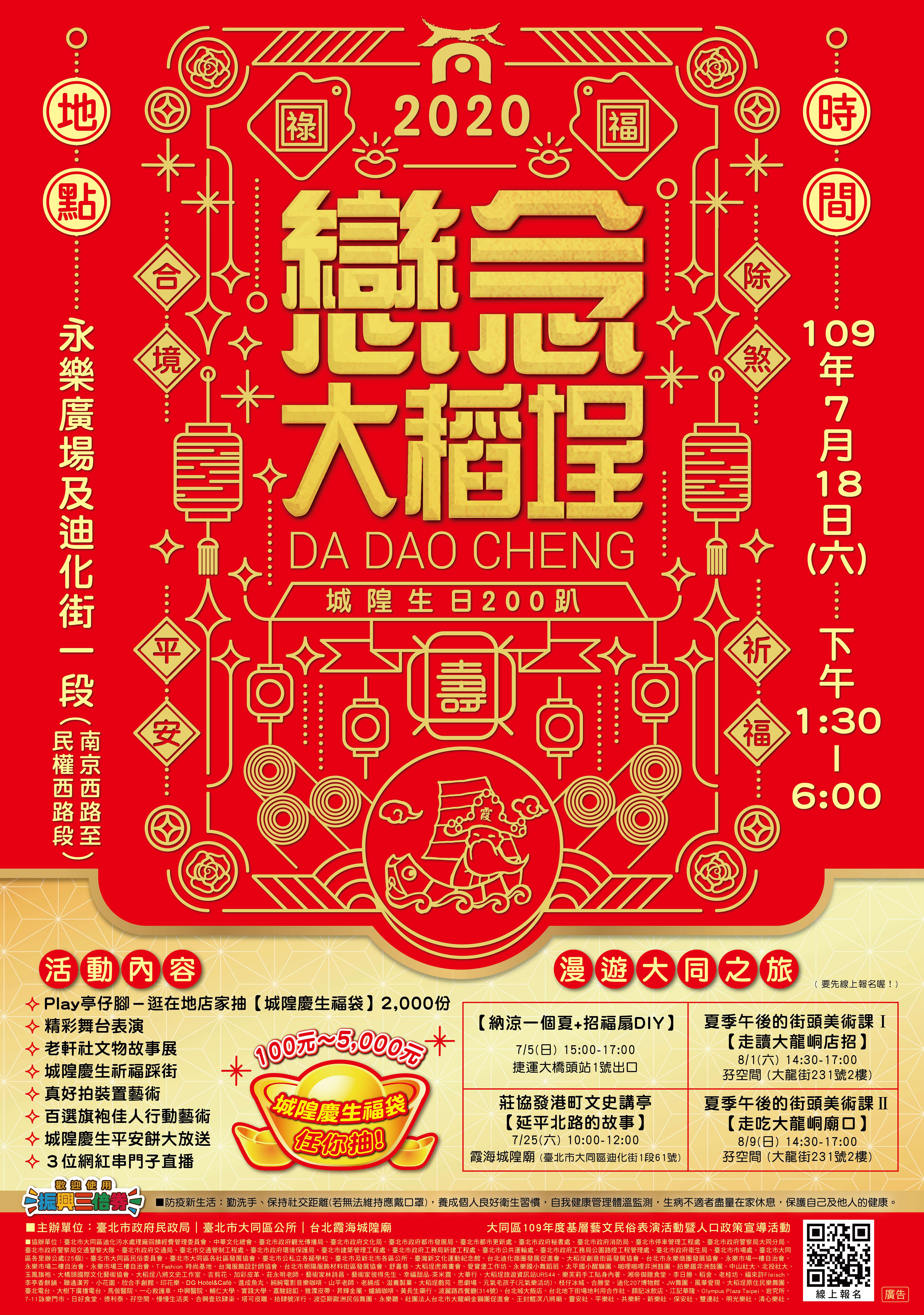 (二)內容:臺北市大同區2020戀念大稻埕系列活動:1.「城隍生日200趴」活動--時間:訂於7月18日(六)下午1時30分至6時,地點:永樂廣場及迪化街一段(南京西路—民權西路段)全線封街舉辦,活動內容:Play亭仔腳—逛在地店家抽【城隍慶生福袋】2000份、精彩舞臺表演、老軒社文物故事展、城隍慶生祈福踩街、真好拍裝置藝術、百選旗袍佳人行動藝術、城隍慶生平安餅大放送及3位網紅串門子直播等。2.漫遊大同走讀之旅--7月5日「【納涼一個夏+招福扇DIY】」、7月25日「莊協發港町文史講亭【延平北路的故事】」、8月1日「夏季午後的街頭美術課I【走讀大龍峒店招】」、8月9日「夏季午後的街頭美術課II【走吃大龍峒廟口】」4場。歡迎市民朋友相揪來參加,活動詳情請至臺北市大同區公所網站或電洽(02)25975323分機802陳先生。