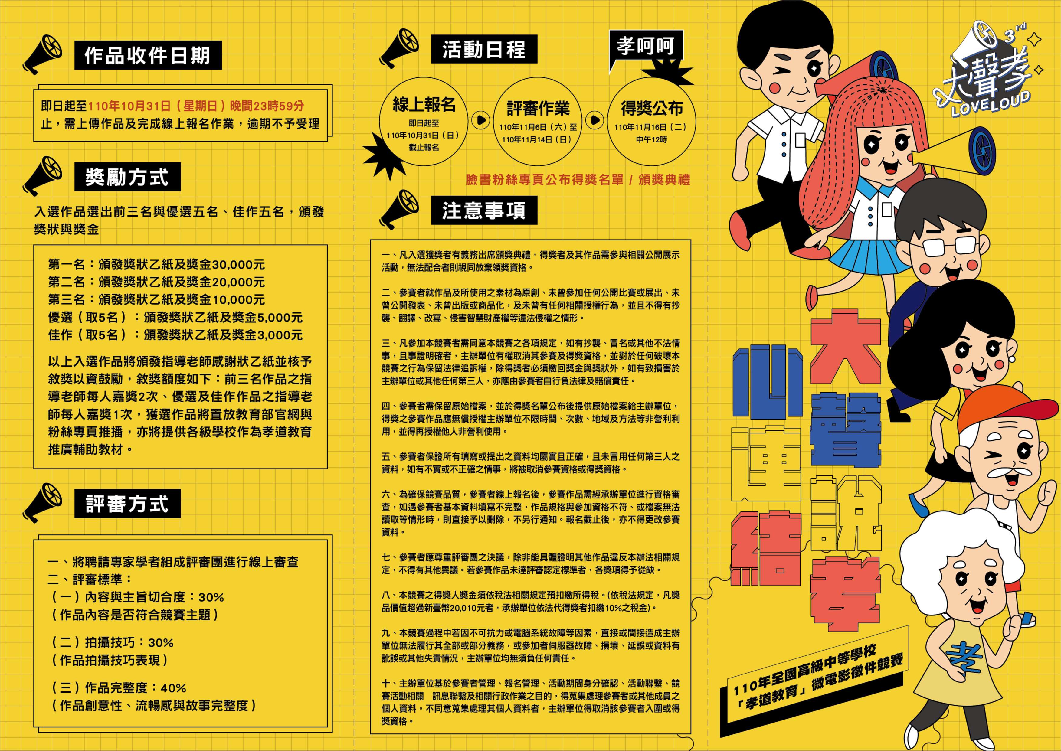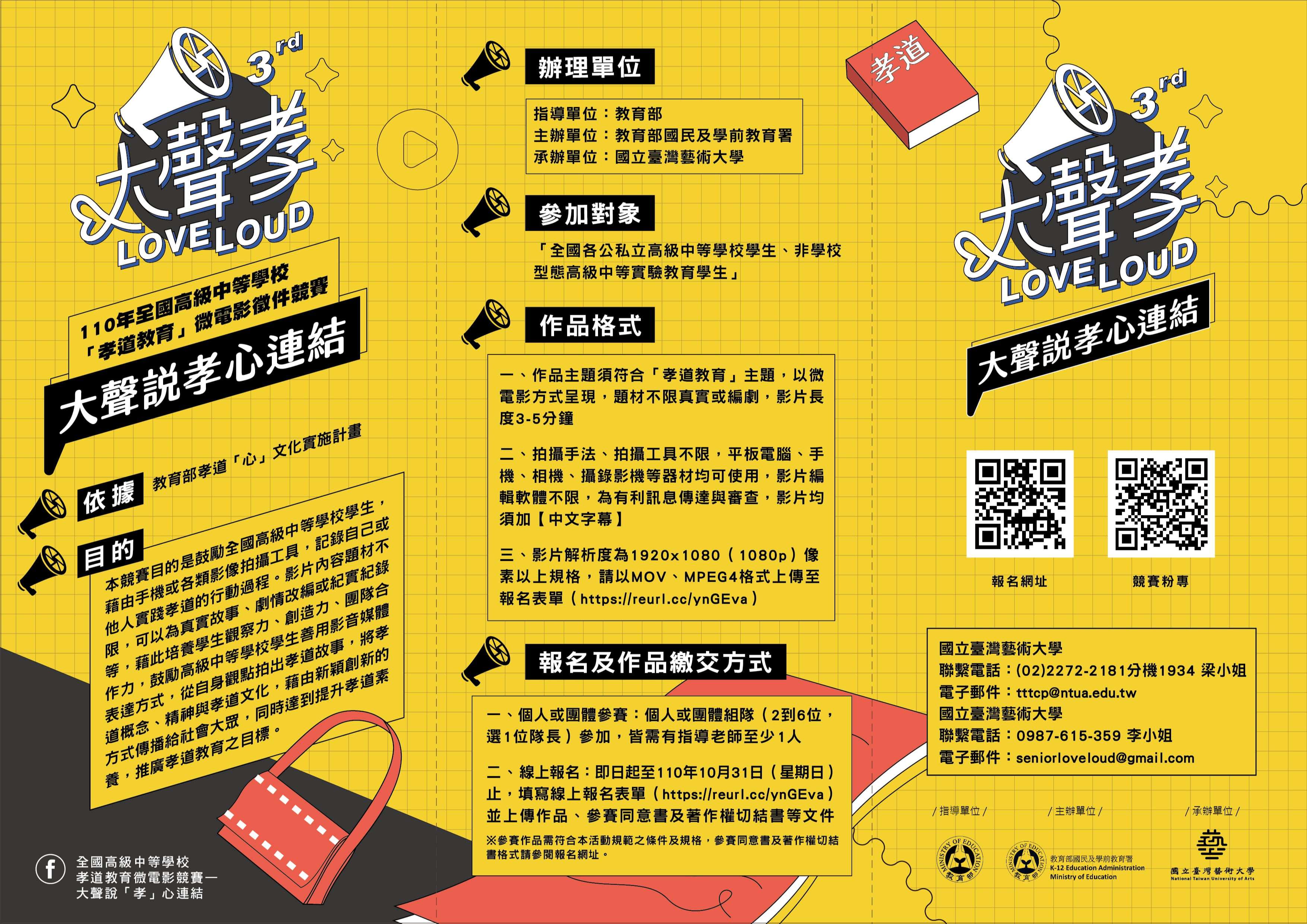 一、依據教育部國教署110年「孝道教育」粉絲專頁與全國高級中等學校學生微電影甄選工作計畫書辦理,鼓勵全國高級中等學校學生運用影音媒體從自身觀點拍出孝道故事,藉由新穎創新的方式將孝道精神傳播給社會大眾。為擴大競賽宣傳,特辦理校園宣傳(線上)講座,加強同學們對影音創作的認識並鼓勵參賽。
