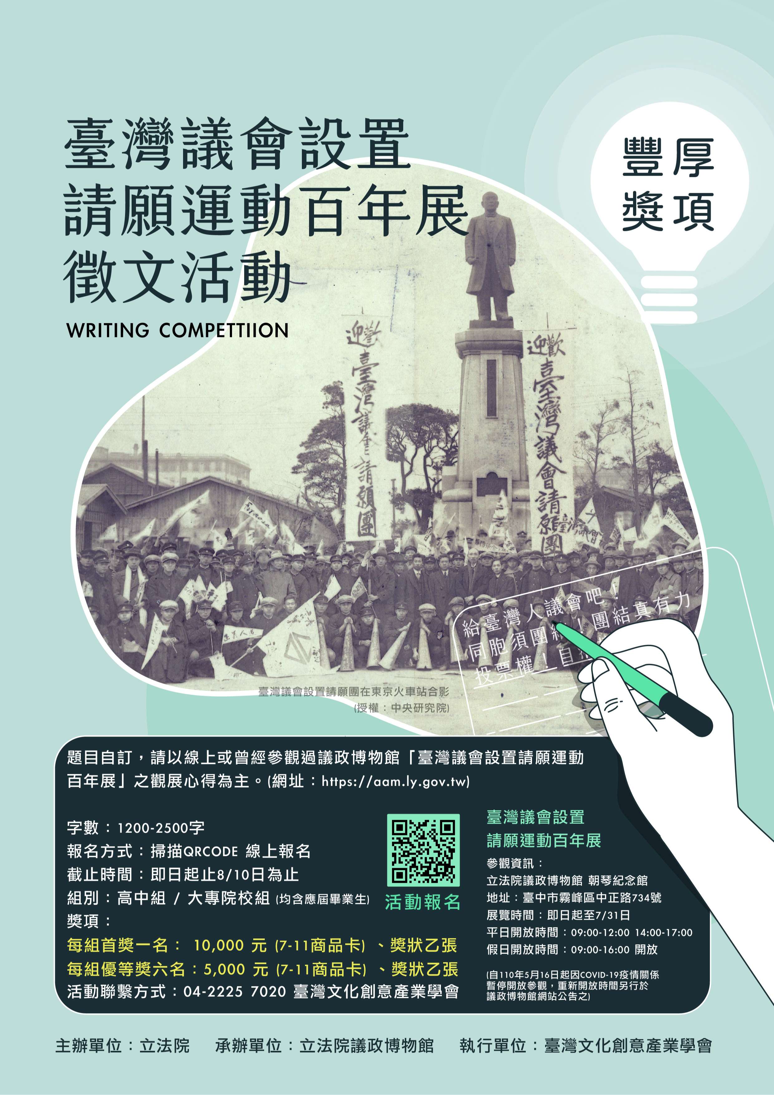 主旨:為紀念臺灣議會設置請願運動一百周年,本館舉辦「臺灣議會設置請願運動百年展徵文活動」,請鼓勵貴校學生踴躍報名參加,敬請查照。