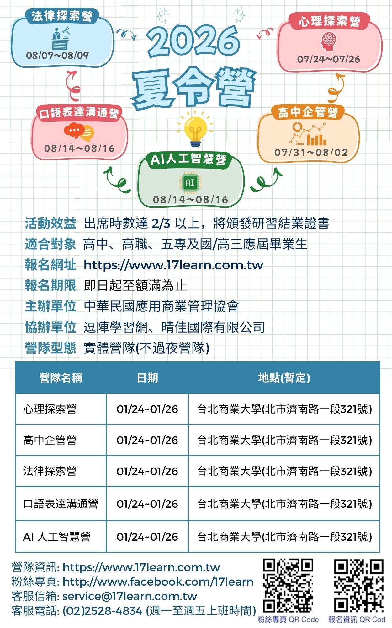 二、營隊名稱:「心理探索營」、「高中企管營」、「口語表達溝通營」、「法律探索營」、「AI人工智慧營」。