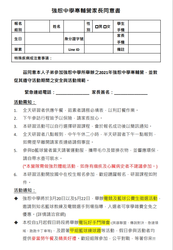 茲同意本人子弟參加強恕中學所舉辦之2021年強恕中學寒輔營,並敦促其遵守活動期間之安全與活動規範。