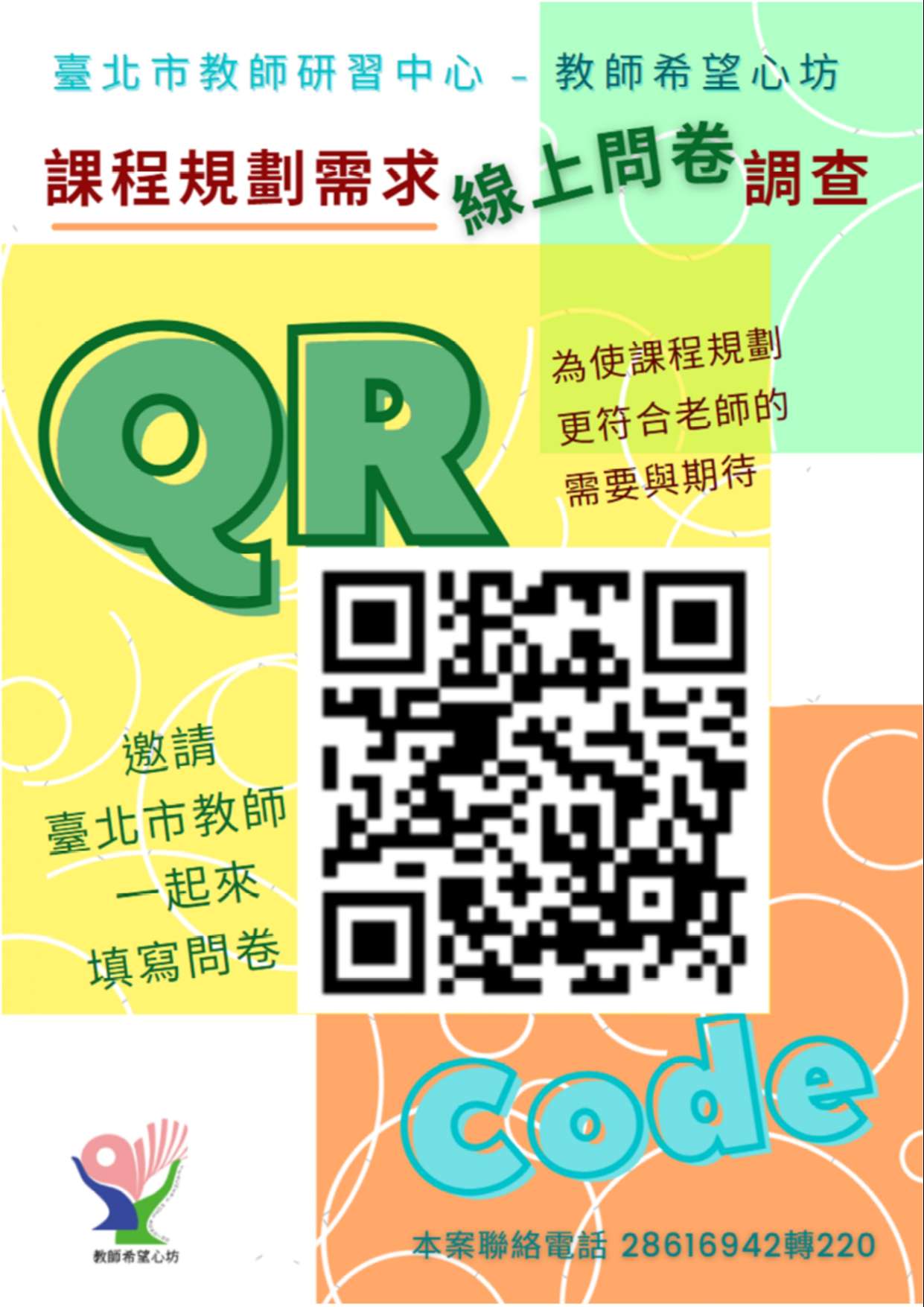 臺北市教師研習中心檢送「教師希望心坊課程規劃需求」線上調查問卷QR Code 1份,請協助公告並轉知所屬教師踴躍上網填寫