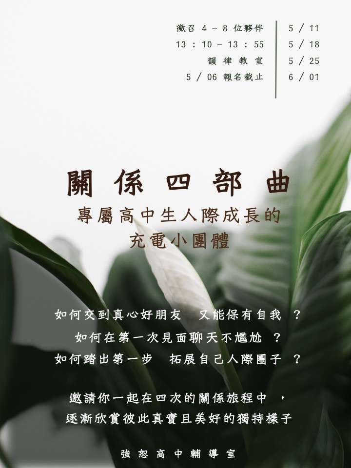 都歡迎你報名強恕高中本學期的:關係四部曲-人際充電小團體!