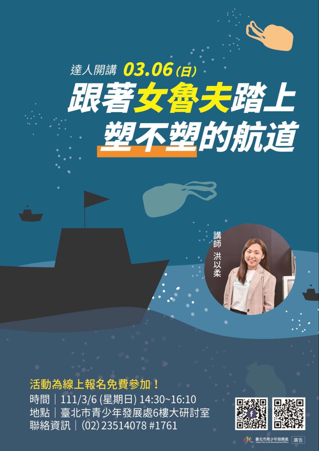 (三)30字:青發處3/6洪以柔開講:跟著女魯夫踏上塑不塑的航道。活動免費詳官網。