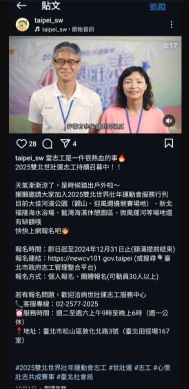 五、本案若有世壯運志工形象影片素材相關疑問,請電洽承辦人2025世壯運志工管理運用處林鈺婷組員02-2720-8889 #1633。