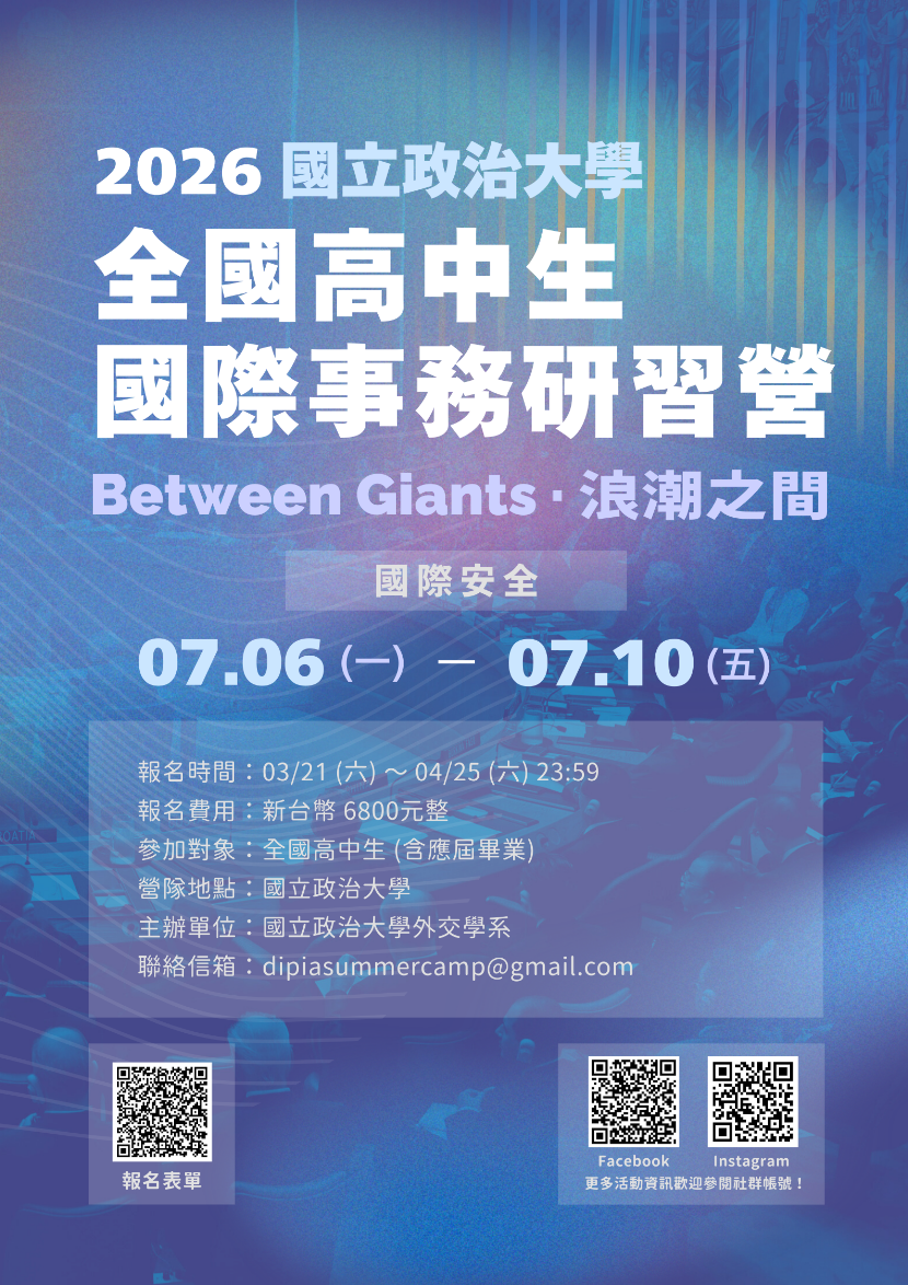 一、本校外交學系於今 115年7月6日(星期一)至7月10日(星期五)舉辦「2026全國高中生國際事務研習營」,為優秀高中生安排系列課程、參觀和育樂活動。