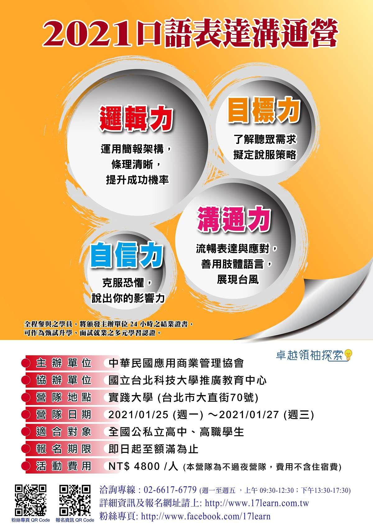 二、營隊目的:提供大量演練與分享討論,讓學員掌握口語溝通表達技巧。全程參與之學員,將頒發主辦單位 24 小時之結業證書。