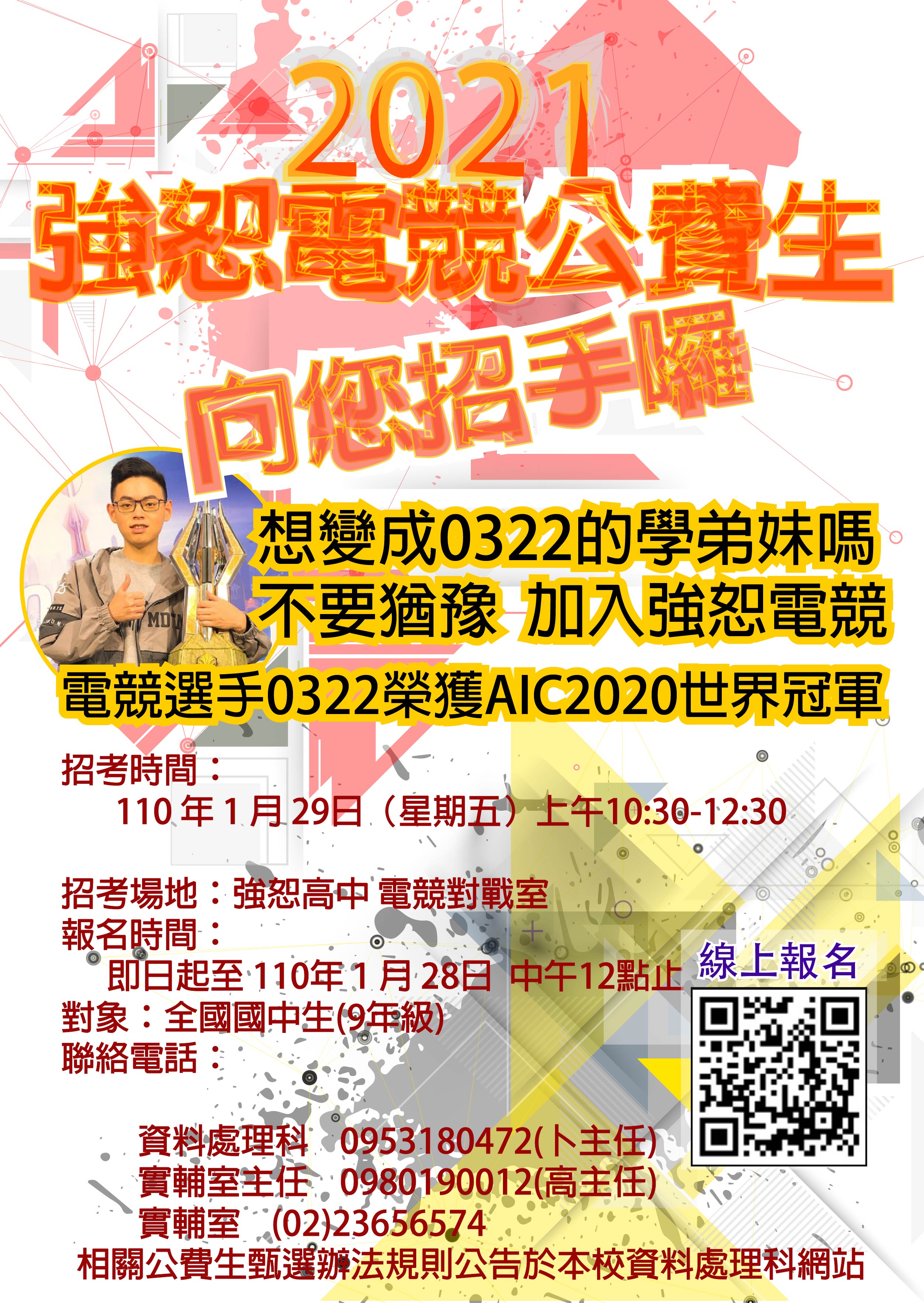 一、招考時間: 1、110 年 01月 29 日(星期五)上午10:30-12:00 二、招考場地:強恕高中 電競訓練室 三、報名時間:即日起至 110 年 1月 28 日 中午12點止 四、招考對象:國中生(9年級) |