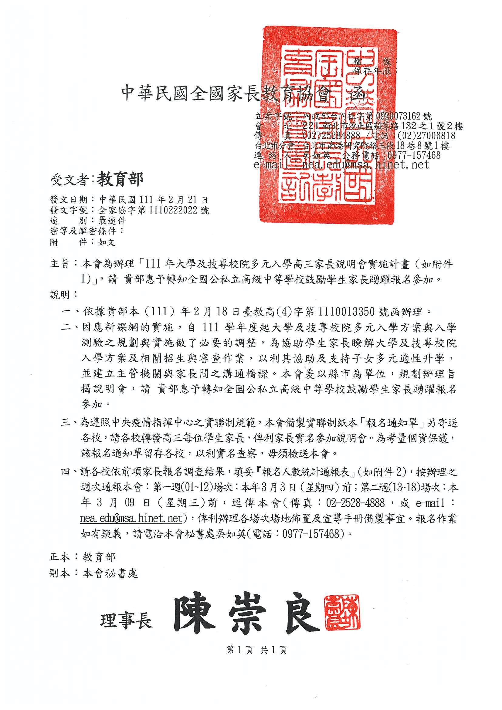 中華民國全國家長教育協會為辦理「111年大學及技專校院多元入學高三家長說明會」案,請貴校轉知並鼓勵學生家長踴躍報名參加