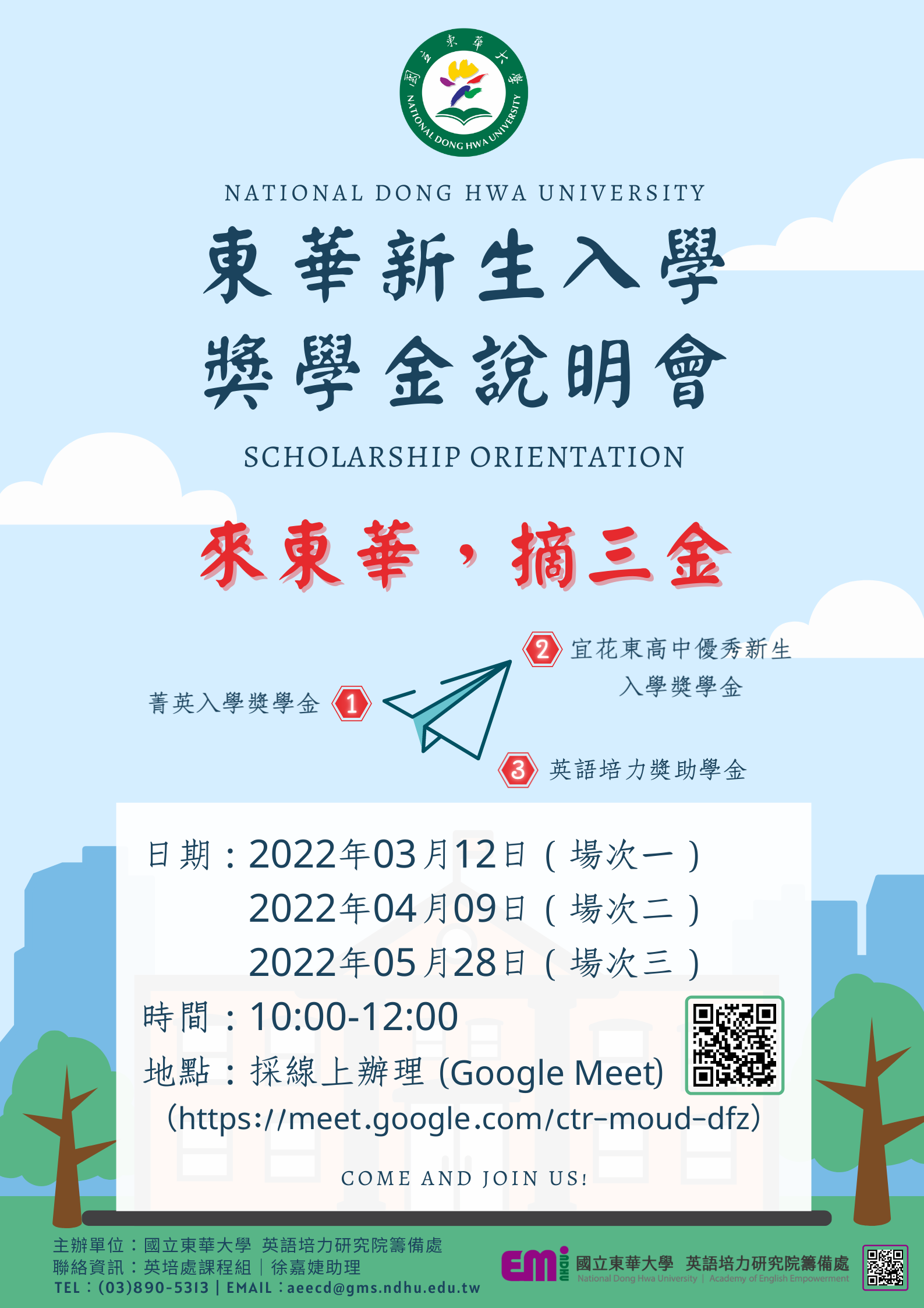 國立東華大學英語培力研究院籌備處將辦理3場次「東華新生入學獎學金說明會」,敬請惠予公告,鼓勵貴校高三師生及家長參與,請查照。
