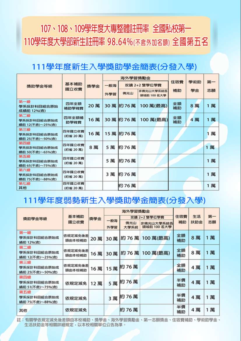 三、本校學生在學四年皆享有「國立收費」,四年省下約20萬,且依學系採計科目組合原始成績前65%(含)以上,入學後享有8至20萬獎助學金及5至30萬的海外獎勵金。另外在校期間的各項學習表現,另可申請21餘種校內獎勵措施。