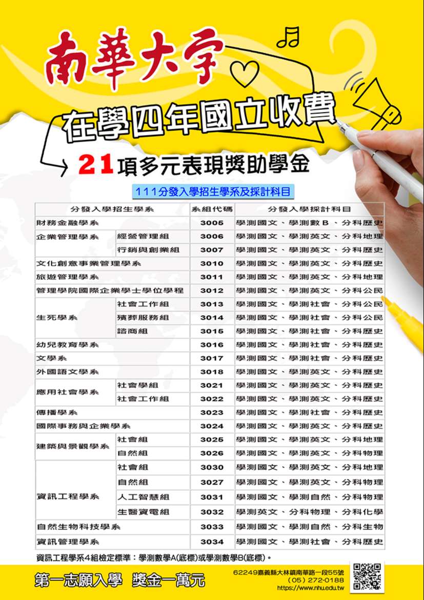 南華大學分發入學考試招生入學管道單張文宣(電子檔及紙本文宣品),敬請惠予協助於貴校網站公告宣傳及分送師生,以提供入學之參考,請查照。