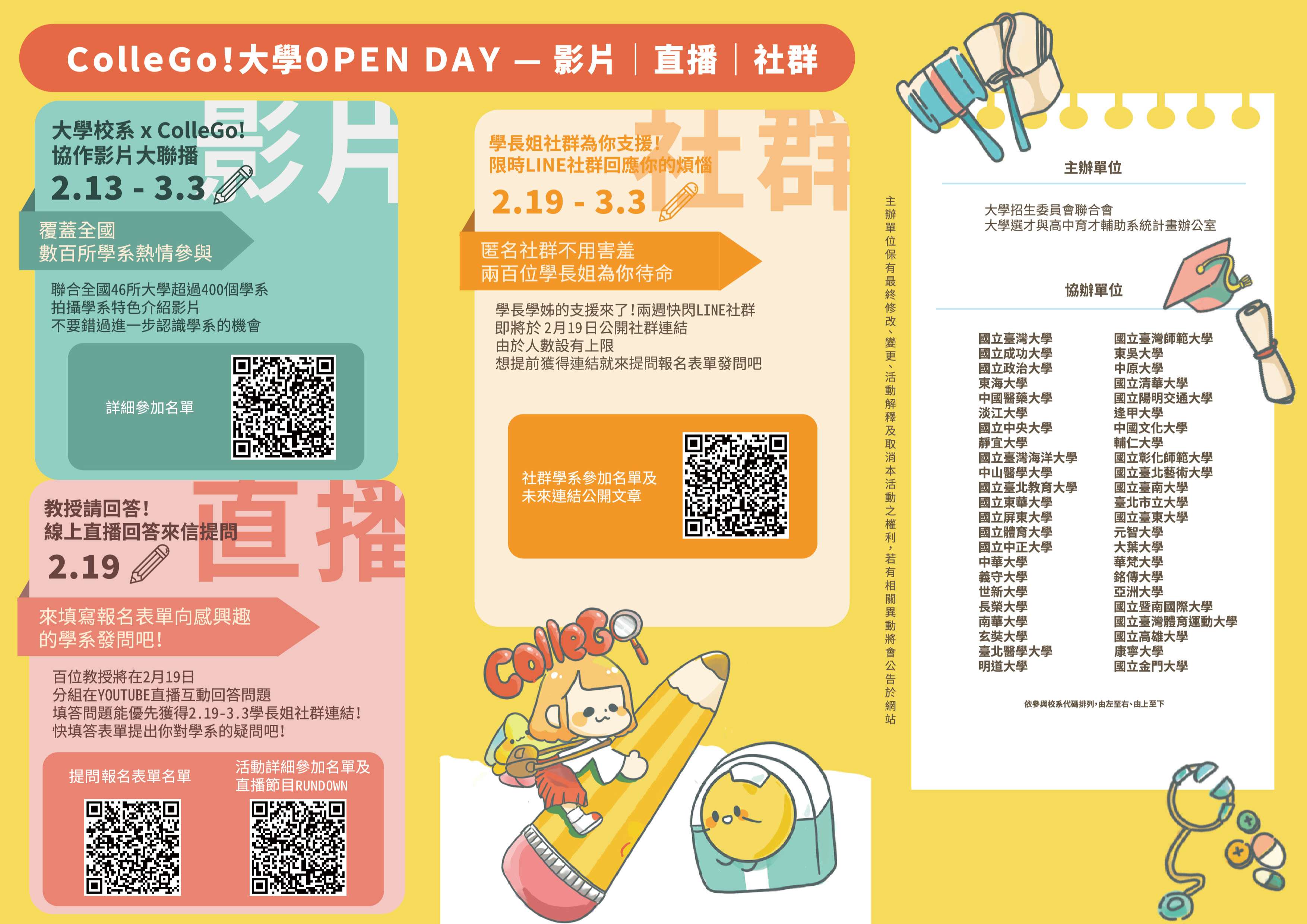 六、影片、直播、社群之網路連結及本活動相關訊息,請見海報上QRCODE或ColleGo!網站內之「焦點話題」(https://collego.edu.tw/Media/portfolio)